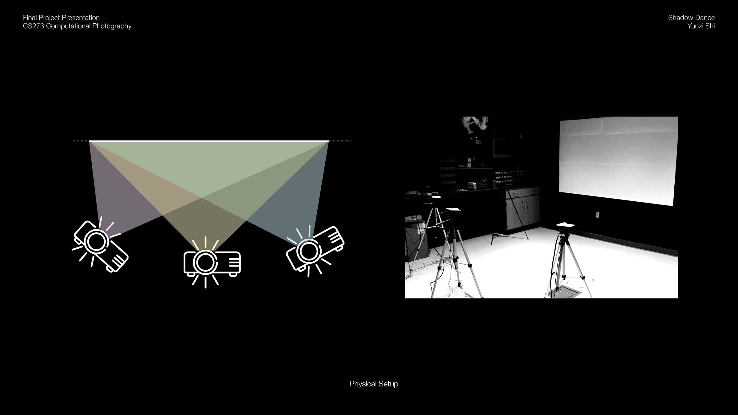 Cast shadows and projectional imaging systems are commonly used in computational photography and artworks, but shadows are commonly perceived as the antithesis of images. My project, "Shadow Dance", creates an art installation that highlights the dual nature of projectors as a source of illumination and an imaging system, and the fact that they simultaneously create images and shadows. Building on Rafael Lozano-Hemmer’s “People on People”, the installation reveals images inside the cast shadows of the viewers as they interact with the projected imagery. The physical installation involves three projectors oriented at different angles. The videos fed to the projectors are preprocessed with planar homography and image decomposition, so the projections align with each other and must be linearly combined to reveal the legible frames. The viewers are encouraged to spontaneously interact with the installation, and reflect on the duality of images and shadows through the discovery inside their cast shadows. This project demonstrates the potential of applying computational photography in art and generating artistic effects that challenge visual conventions and reveal scientific facts beyond general optics.